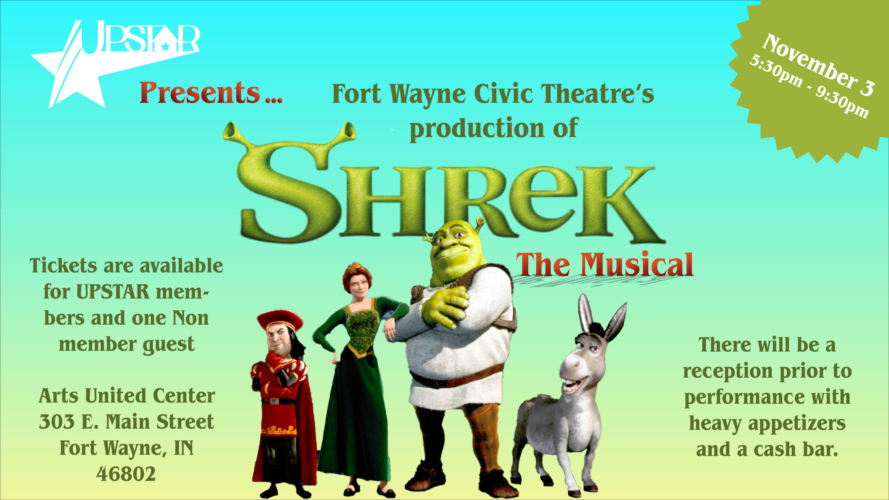 REGISTRATION OPENS AT 2 PM ON FRIDAY, OCT. 13, 2023 FOR UPSTAR'S PRIVATE SHOWING OF CIVIC THEATRE'S SHREK THE MUSICAL - NOV 3, 2023 | Based on the Oscar-winning DreamWorks Animation film, Shrek The Musical is a Tony Award-winning fairy tale adventure! Shrek brings all the beloved characters you know from the film to life on stage and proves there's more to the story than meets the ears. | "Once upon a time, there was a little ogre named Shrek..." And thus begins the tale of an unlikely hero who finds himself on a life-changing journey alongside a wisecracking Donkey and a feisty princess who resists her rescue. Throw in a short-tempered bad guy, a cookie with an attitude, and over a dozen other fairy tale misfits, and you've got the kind of mess that calls for a real hero. Luckily, there's one on hand... and his name is Shrek. Irreverently fun for the whole family, Shrek proves that beauty is truly in the eye of the ogre.